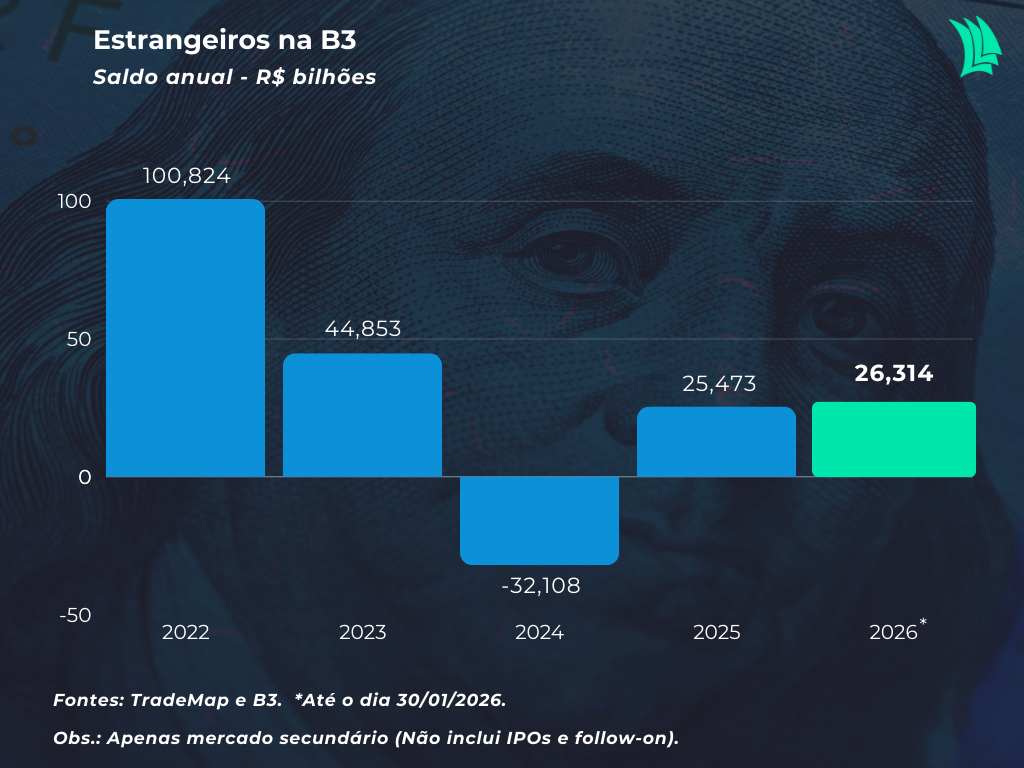 Janeiro de 2026 começou de forma excepcional para o mercado brasileiro. Em apenas um mês, o fluxo de capital estrangeiro para a B3 superou todo o volume registrado ao longo de 2025, sinalizando uma mudança relevante na percepção do investidor internacional sobre a Bolsa brasileira. O saldo líquido somou R$ 26,314 bilhões, acima dos R$ 25,473 bilhões acumulados nos doze meses do ano anterior, desconsiderando ofertas públicas iniciais (IPOs) e operações de follow-on.