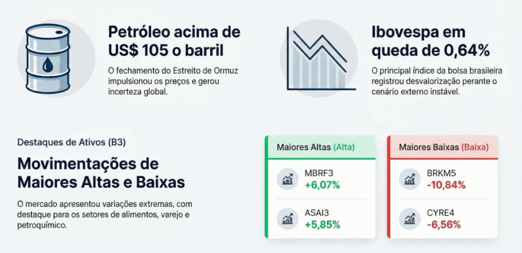No campo geopolítico, os Estados Unidos prorrogaram por mais um dia os ataques à infraestrutura iraniana. Paralelamente, o Estreito de Ormuz mantém-se fechado e com fluxo limitado. Dessa forma, o petróleo subiu, rompeu os US$ 105 e balizou os mercados globais.