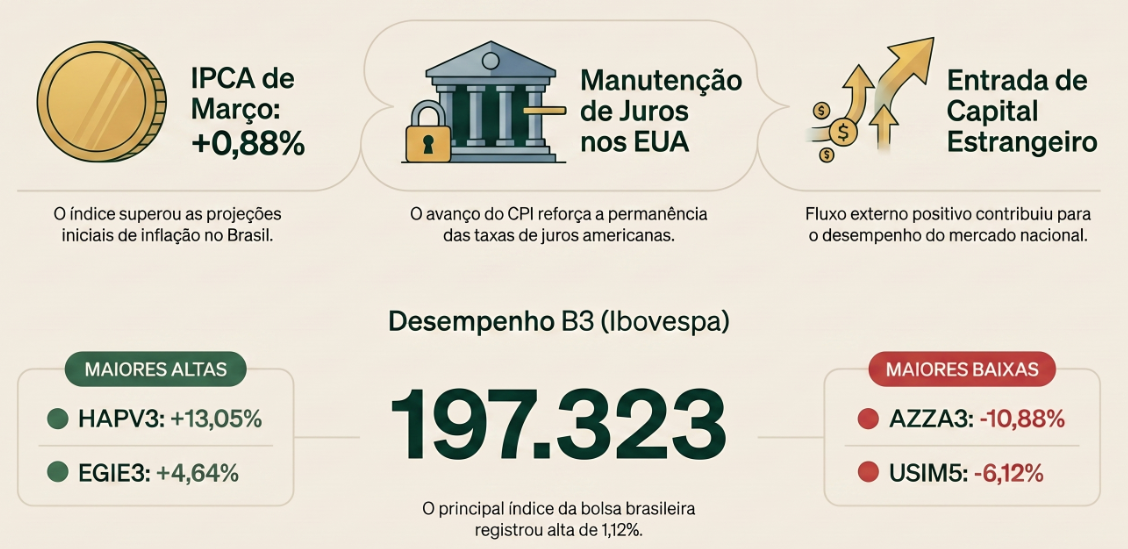 No cenário internacional, o mercado acompanhou as negociações entre os Estados Unidos e o Irã no Paquistão. O parlamento iraniano condicionou o início das tratativas a um cessar-fogo no Líbano e à liberação de ativos do país. No âmbito doméstico, o IPCA de março registrou alta de 0,88%, superando as projeções, sob influência do grupo de transportes e da variação dos preços dos combustíveis. Nos Estados Unidos, o índice de preços ao consumidor (CPI) também apresentou avanço, reforçando a avaliação de manutenção das taxas de juros pelo Federal Reserve.