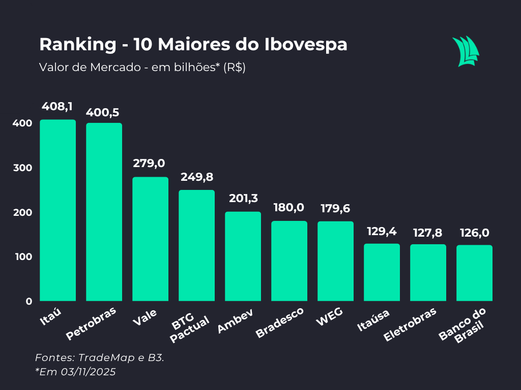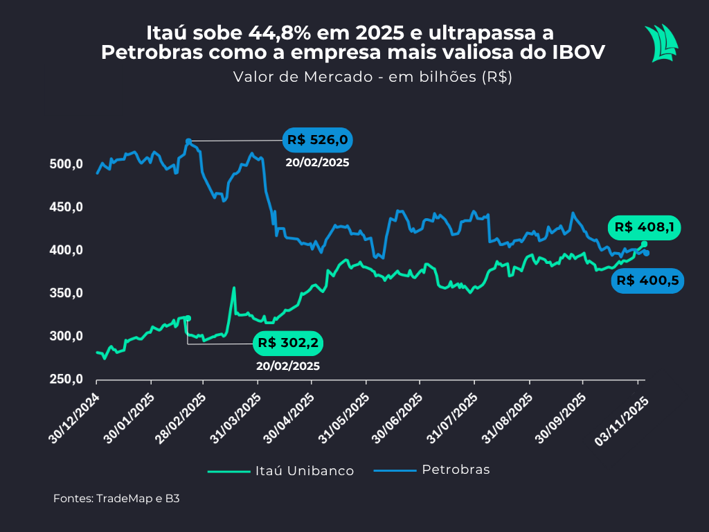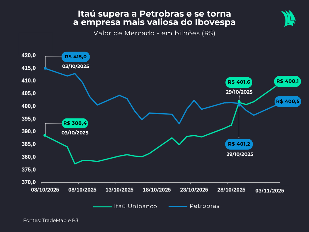 Na última quarta-feira 29 de outubro, o Itaú Unibanco se tornou a empresa mais valiosa do Ibovespa ao atingir valor de mercado de R$ 401,6 bilhões, superando a Petrobras, avaliada em R$ 401,2 bilhões. É a primeira vez desde 2020 que o banco retoma de forma consistente o posto de empresa mais valiosa da bolsa brasileira, liderando o ranking à frente de companhias como Vale e BTG Pactual.