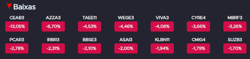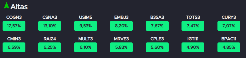 Esse conjunto de fatores influenciou o desempenho dos ativos ao longo da semana. A seguir, confira as maiores altas e baixas do Ibovespa no período.