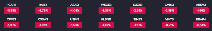 Assaí (ASAI3) perdeu 4,04% após o Carrefour anunciar plano estratégico até 2030 com foco em ampliar a competitividade no atacarejo, incluindo política de preços mais agressiva e expansão de lojas, o que tende a intensificar a concorrência no setor.