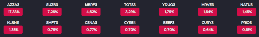 Suzano (SUZB3) caiu 7,26%, após rebaixamento de recomendação pelo Bank of America e corte significativo no preço-alvo. A ação também apresentou forte volatilidade, chegando a entrar em leilão na B3, refletindo ajustes de expectativa para o setor de papel e celulose.