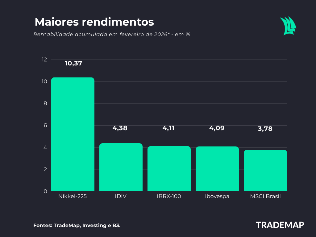 O Nikkei 225 liderou os ganhos globais em fevereiro, com valorização de 10,37%. Principal indicador da Bolsa de Tóquio, o índice foi impulsionado pelo desempenho de empresas dos setores de tecnologia, semicondutores, indústria, robótica e automotivo, beneficiadas pelo iene depreciado e pelo aumento dos investimentos globais em inovação. Entre os destaques estiveram SoftBank e Mitsubishi UFJ Financial Group, que registraram forte alta no período. O movimento também foi sustentado por reformas de governança corporativa na bolsa japonesa e por expectativas de postura mais acomodatícia do Bank of Japan.