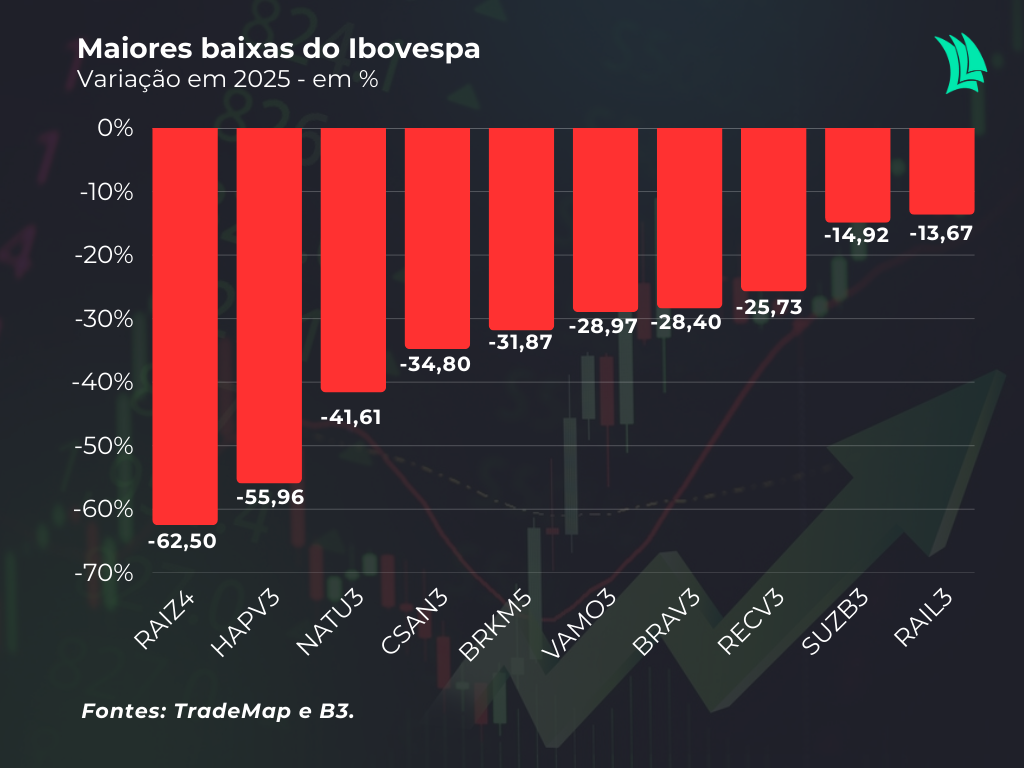 A Raízen liderou as quedas do Ibovespa em 2025, com recuo de 62,50%, refletindo principalmente a compressão das margens no etanol em um ambiente de preços menos favorável, além do alto nível de endividamento após um ciclo intenso de investimentos. O mercado passou a questionar o ritmo de desalavancagem e o prazo de maturação dos projetos, aumentando a percepção de risco em um cenário de juros elevados.